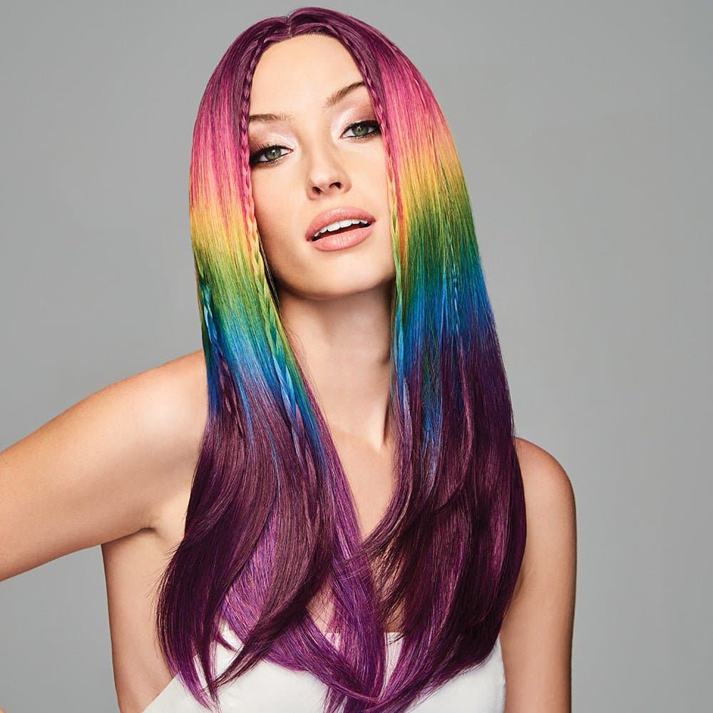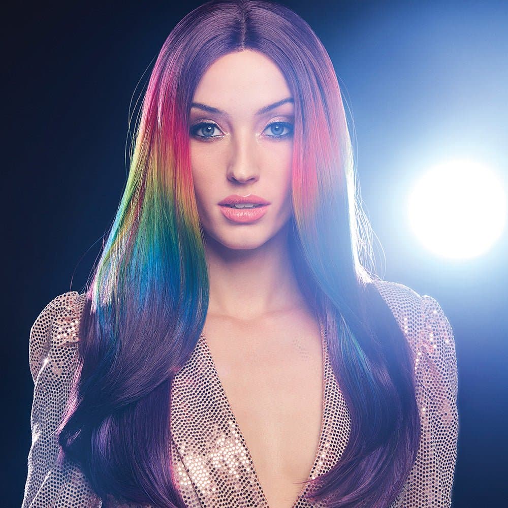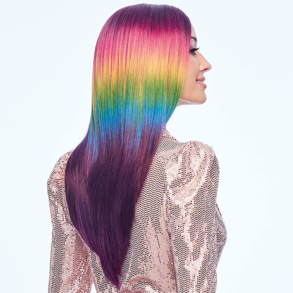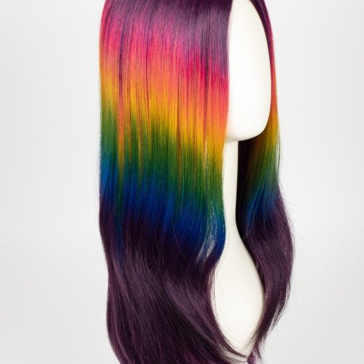 Party All Night by Hairdo is perfect for those seeking a trendy and vibrant look. The long, straight hair is a deep purple with a bright, iridescent rainbow for a striking contrast. The Tru2Life heat friendly synthetic hair gives you the option to wear the hair straight or glam up with curls and waves. The center monofilament part gives the appearance of natural hair growth, and the sheer lace front provides flawless hairline.