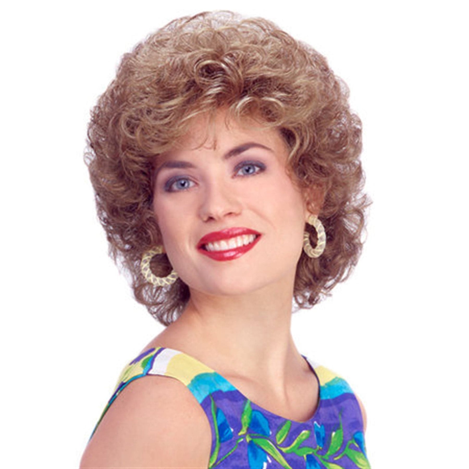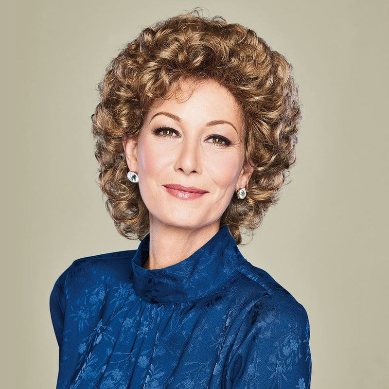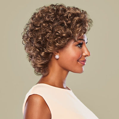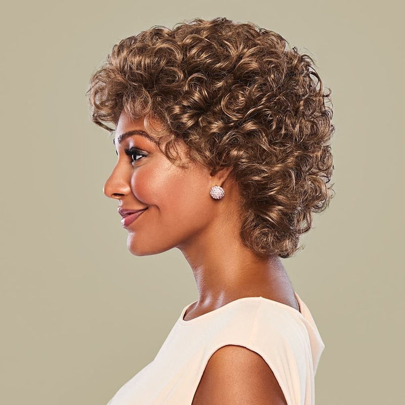 Oh so soft! All-over loosely curled ringlets frame the face and the feminine nape length falls just below the collar.