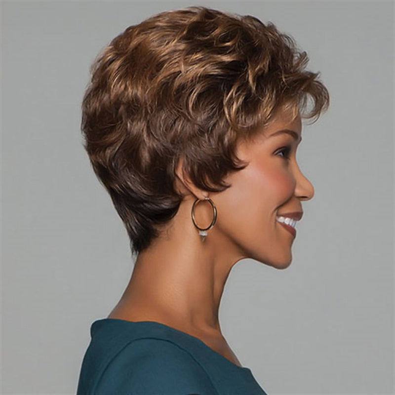 Introducing Cheer by Gabor. Featuring a contemporary short cut, the all-over layering and razor tapering transforms the softly curled hair into a modern silhouette. Perfect for daily wear and special occasions!